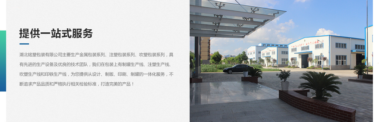 湖北銘塑包裝有限公司一家集研發(fā)、生產(chǎn)、銷售于一體的較優(yōu)秀民營企業(yè),技術力量雄厚,產(chǎn)品質量可靠。位于交通暢順,百業(yè)興旺、經(jīng)濟富裕、政策開放的孝感開發(fā)區(qū)域。我們企業(yè)的營銷戰(zhàn)略是以建筑為土壤,以產(chǎn)品為種子,以質量為肥料,讓綠色鋪滿全球。憑借多年來的行業(yè)經(jīng)驗,公司不斷進行創(chuàng)新和研發(fā),為市場提供更廣泛的產(chǎn)品應用領域和更好環(huán)保節(jié)能產(chǎn)品,為國家能源環(huán)保戰(zhàn)略和可持續(xù)發(fā)展戰(zhàn)略作出應有的貢獻。     湖北銘塑包裝有限公司主要生產(chǎn)金屬包裝系列、注塑包裝系列、吹塑包裝系列,具有先進的生產(chǎn)設備及優(yōu)良的技術團隊,我們在包裝上有制罐生產(chǎn)線、注塑生產(chǎn)線、吹塑生產(chǎn)線和印鐵生產(chǎn)線,為您提供從設計、制版、印刷、制罐的一體化服務,不斷追求產(chǎn)品品質和嚴格執(zhí)行相關檢驗標準,打造更好的產(chǎn)品!
